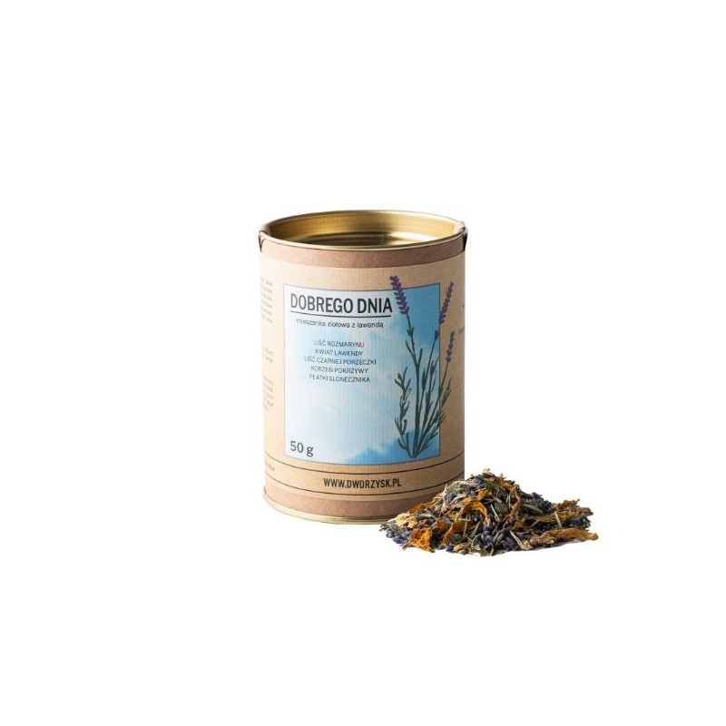 Ziołowa mieszanka na bazie lawendy i rozmarynu, dzięki której dobrze zaczniesz dzień. Rozmaryn i czarna porzeczka wspomagają krążenie krwi, a lawenda uspokaja umysł. Płatki słonecznika wraz z korzeniem pokrzywy wpływają na prawidłową przemianę materii. Wszystkie zioła zawarte w mieszance działają rozkurczowo, wzmacniają układ nerwowy i ułatwiają koncentrację. Wspierają także organizm w walce z napięciem i stresem.